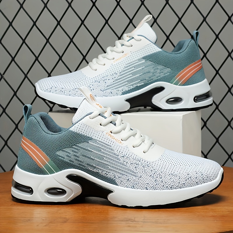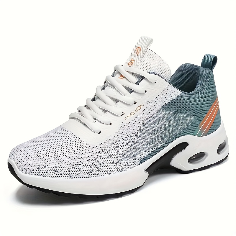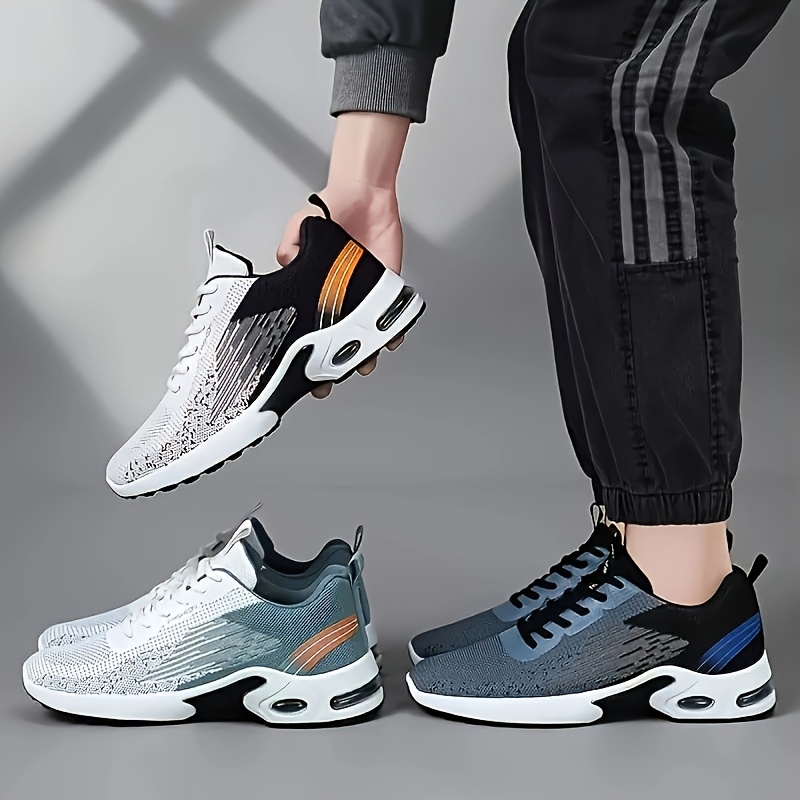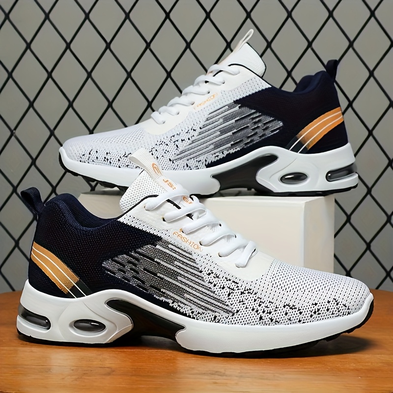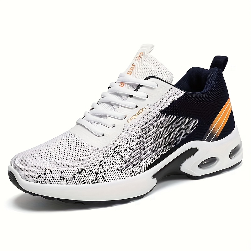 メンズ通気性ニットランニングスニーカー - 快適な滑り止めエアクッションサポート付き、ブラック&ホワイトにオレンジのアクセント、大きいサイズでフィットネス&カジュアルウェア向け