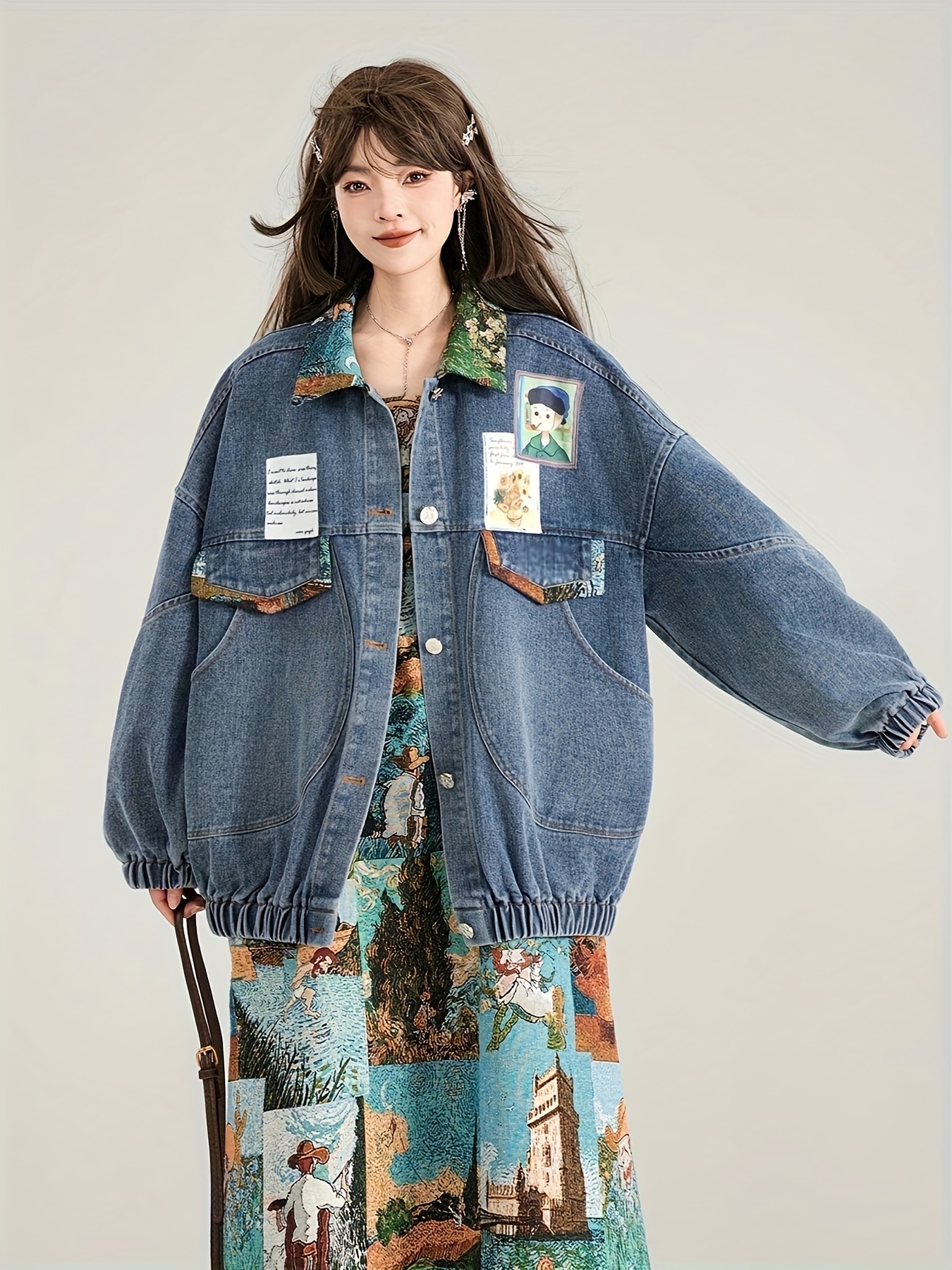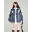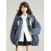 1ピース レディース ヴィンテージ 長袖 リボン デタール デニムジャケット、フレンチスタイル エレガント ルーズフィット ポリエステル ブレザー、春/秋 カジュアル レタープリント ジャケット プラスサイズ 女性用