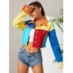 カラーブロックロートリムパッチワークスタイリッシュ長袖クロップドストリートウェアデニムジャケット、レディースデニムジーンズ&衣料品