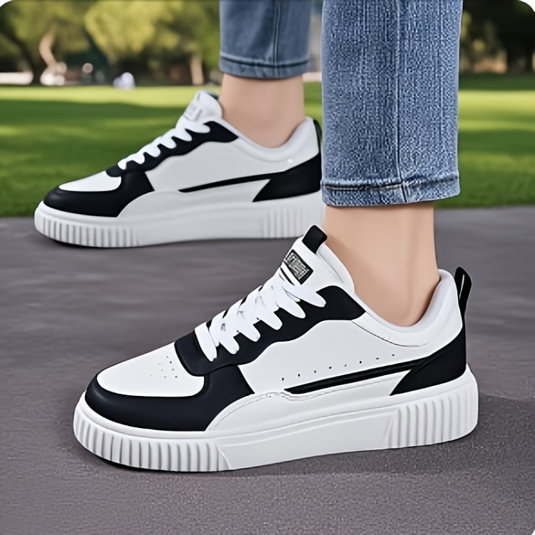 メンズクラシックホワイト&ブラックスニーカー - カジュアルなレースアップロートップウォーキングとスケートシューズ、快適なオールシーズンアウトドアハイキングと日常使用、カジュアルウォーキングシューズ | クラシックスニーカーデザイン | 耐久性のあるフットウェア