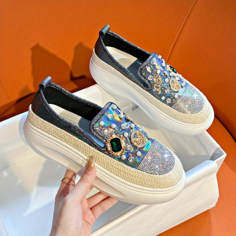 女性用スパークリングラインストーンローファー - グリッターラウンドトゥスリップオンスニーカー、メタリックアクセント付き快適なロートプラットフォームシューズ
