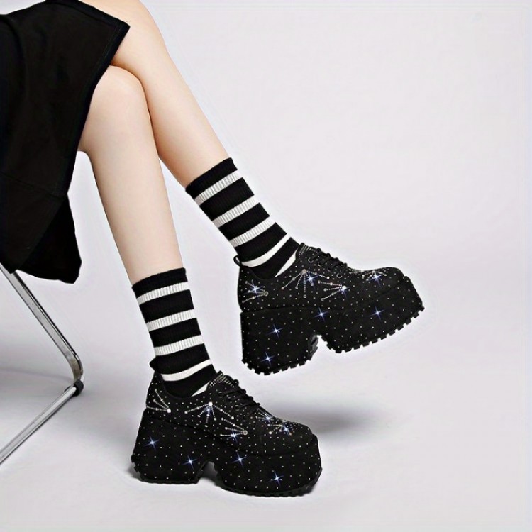 レディース ファッション ラインストーン プラットフォーム スニーカー - ホワイト ロートップ レースアップ、キラキラ星デザイン、ラウンドトゥ、厚手のゴムソール オールシーズン用