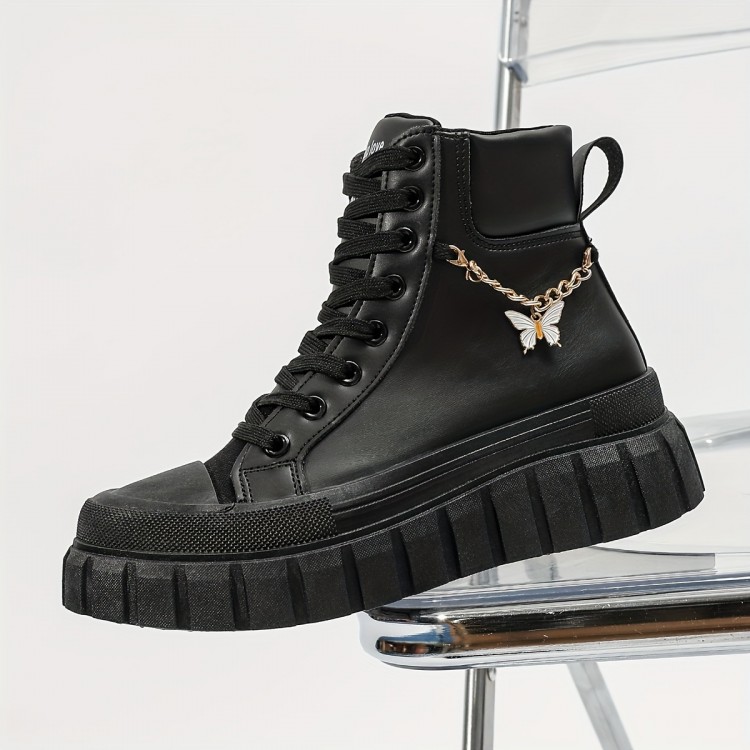 女性のチャンキープラットフォームスニーカー、蝶のチャーム付きハイカットレースアップカジュアルシューズ、毎日のアウトドアウェアに快適な厚底ソール