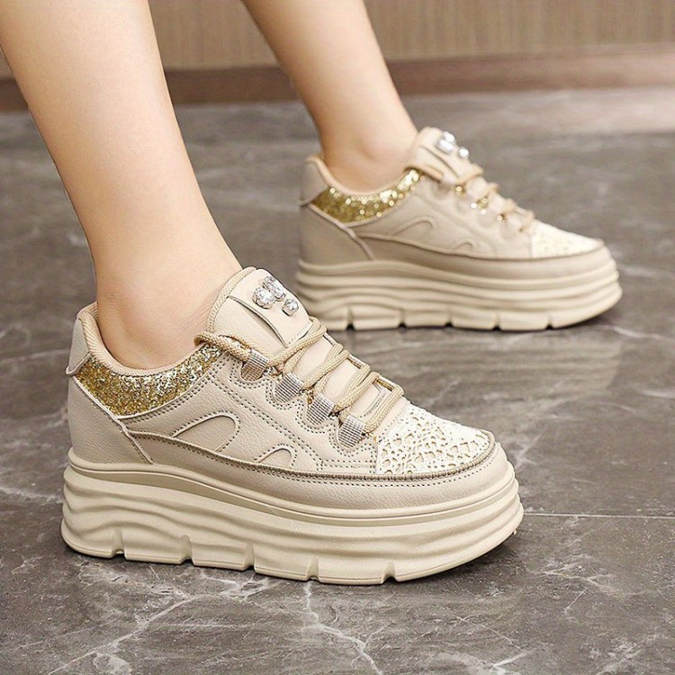 レディース チャンキープラットフォームスニーカー - 通気性メッシュライニング、耐久性PUソール、ロートップラウンドトゥレースアップカジュアルシューズ、オールシーズンの快適さ&多様なスタイル、快適な歩行用 | ラウンドトゥフットウェア | Pu合成カバー