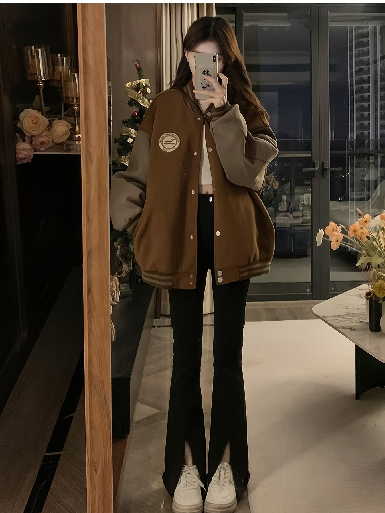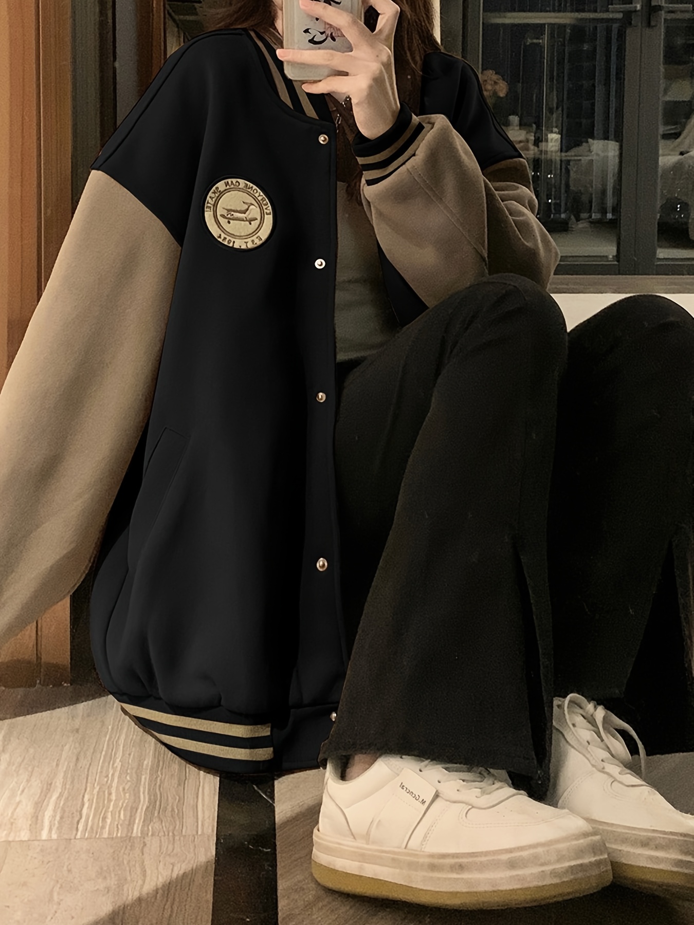 女性用ブラックベースボールジャケット、ゴールドロゴ付き - カジュアル春のアウターウェア、ポリエステル100%、ラウンドネックPU生地、ストライプリブディテール、滑らかな質感、ゆったりフィットアメリカンスタイル、日常使いアウターウェア |カジュアルシックジャケット|ポリエステルファブリックジャケット